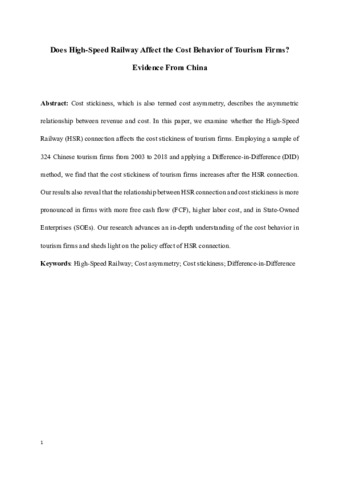 Cost stickiness, which is also termed cost asymmetry, describes the asymmetric relationship between revenue and cost. In this study, we examine whether high-speed railway (HSR) connection affects the cost stickiness of tourism firms. Employing a sample of 324 Chinese tourism firms from 2003 to 2018 and applying a difference-in-difference (DID) method, we find that the cost stickiness of tourism firms increases after HSR connection. Our results also reveal that the relationship between HSR connection and cost stickiness is more pronounced in firms with higher free cash flow (FCF), higher labor costs, and in state-owned enterprises (SOEs). Our research advances an indepth understanding of the cost behavior in tourism firms and sheds light on the policy effect of HSR connection.