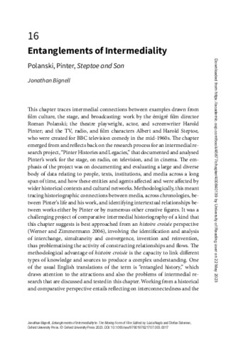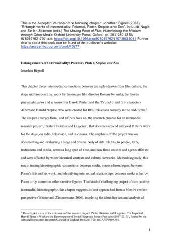 Bignell, J. orcid id iconORCID: https://orcid.org/0000-0003-4874-1601 (2023) Entanglements of intermediality: Polanski, Pinter, Steptoe and Son. In: Nagib, L. orcid id iconORCID: https://orcid.org/0000-0001-8808-9748 and Solomon, S. (eds.) The Moving Form of Film: Historicising the Medium through Other Media. Oxford University Press, Oxford, pp. 267-280. ISBN 9780197621707 doi: 10.1093/oso/9780197621707.003.0017