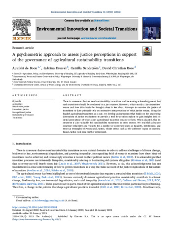 de Boon, A., Dressel, S., Sandström, C. and Rose, D. C. (2023) A psychometric approach to assess justice perceptions in support of the governance of agricultural sustainability transitions. Environmental Innovation and Societal Transitions, 46. 100694. ISSN 2210-4232 doi: 10.1016/j.eist.2023.100694