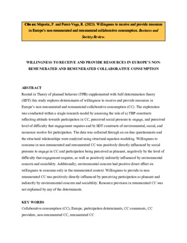 Roos, D., & Hahn, R. (2019). Understanding Collaborative Consumption: An Extension of the Theory of Planned Behavior with Value-Based Personal Norms. Journal of Business Ethics, 158, 679-697.