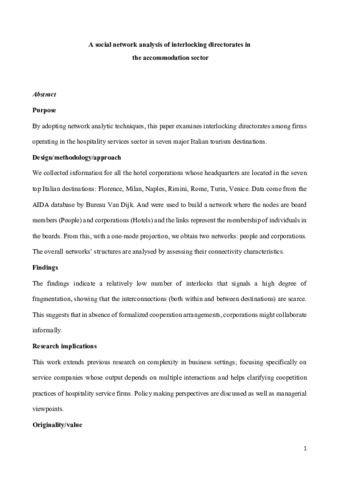 Purpose By adopting network analytic techniques, this paper aims to examine interlocking directorates among firms operating in the hospitality services sector in seven major Italian tourism destinations. Design/methodology/approach The authors collected information for all the hotel corporations whose headquarters are located in the seven top Italian destinations: Florence, Milan, Naples, Rimini, Rome, Turin and Venice. Data come from the Analisi Informatizzata delle Aziende Italiane database by Bureau Van Dijk and were used to build a network where the nodes are board members (people) and corporations (hotels) and the links represent the membership of individuals in the boards. From this, with a one-mode projection, the authors obtain two networks: people and corporations. The overall networks’ structures are analysed by assessing their connectivity characteristics. Findings The findings indicate a relatively low number of interlocks that signals a high degree of fragmentation, showing that the interconnections (both within and between destinations) are scarce. This suggests that in absence of formalized cooperation arrangements, corporations might collaborate informally. Research limitations/implications This work extends previous research on complexity in business settings, focusing specifically on service companies whose output depends on multiple interactions and helps clarifying coopetition practices of hospitality service firms. Policymaking perspectives are discussed as well as managerial viewpoints. Originality/value Not many studies of the interlocking directorates in the hospitality domain exist. This paper uses network analysis for a better understanding of the cooperative practices and the formal social structures of the Italian hospitality industry and derives a series of implications important for both researchers and practitioners while also looking at potential future studies.