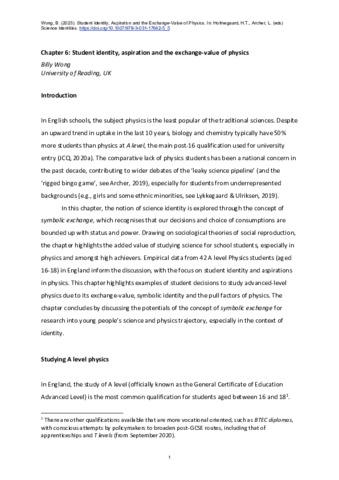 Wong, B. orcid id iconORCID: https://orcid.org/0000-0002-7310-6418 (2023) Student identity, aspiration and the exchange-value of physics. In: Holmegaard, H. T. and Archer, L. (eds.) Science Identities: Theory, method and research. Contributions from Science Education Research (12). Springer, Cham, pp. 95-110. ISBN 9783031176418 doi: 10.1007/978-3-031-17642-5_5
