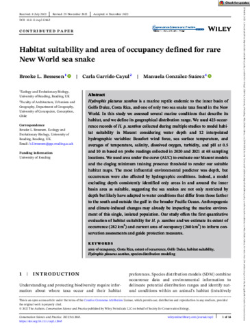 Hydrophis platurus xanthosis a marine reptile endemic to the inner basin ofGolfo Dulce, Costa Rica, and one of only two sea snake taxa found in the NewWorld. In this study we assessed several marine conditions that describe itshabitat, and we define its geographical distribution range. We used 423 occur-rence records ofH. p. xanthoscollected during multiple studies to model habi-tat suitability in Maxent considering water depth and 12 interpolatedhydrographic variables: Beaufort wind force, sea surface temperature, andaverages of temperature, salinity, dissolved oxygen, turbidity, and pH at 0.5and 10 m based on probe readings collected in 2020 and 2021 at 68 samplinglocations. We used area under the curve (AUC) to evaluate our Maxent modelsand the cloglog minimum training presence threshold to render our suitablehabitat maps. The most influential environmental predictor was depth, butoccurrences were also affected by hydrographic conditions. Indeed, a modelexcluding depth consistently identified only areas in and around the innerbasin area as suitable, suggesting the sea snakes are not only restricted bydepth but likely have adapted to water conditions that differ from those fartherto the south and outside the gulf in the broader Pacific Ocean. Anthropogenicand climate-induced changes may already be impacting the marine environ-ment of this single, isolated population. Our study offers the first quantitativeevaluation of habitat suitability forH. p. xanthosand we estimate its extent ofoccurrence (282 km2) and current area of occupancy (260 km2) to inform con-servation assessments and guide protection measures.