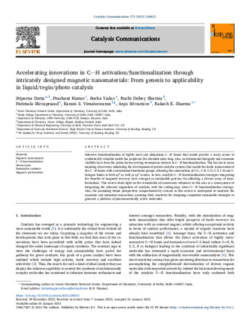 Dutta, S., Kumar, P., Yadav, S., Sharma, R. D., Shivaprasad, P., Vimaleswaran, K. S. orcid id iconORCID: https://orcid.org/0000-0002-8485-8930, Srivastava, A. and Sharma, R. K. (2023) Accelerating innovations in C-H activation/functionalization through intricately designed magnetic nanomaterials: from genesis to applicability in liquid/regio/photo catalysis. Catalysis Communications, 175. 106615. ISSN 1566-7367 doi: 10.1016/j.catcom.2023.106615