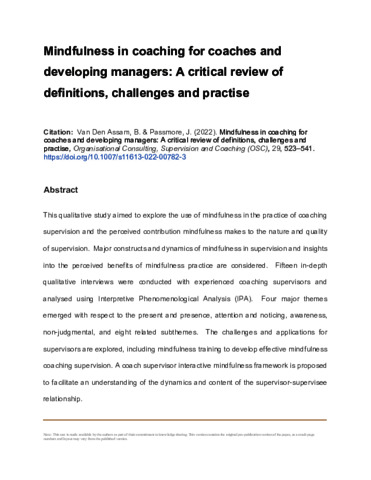 Van Den Assam, B., Passmore, J. orcid id iconORCID: https://orcid.org/0000-0003-0832-7510 and Dulewicz, V. (2022) How coaching supervisors experience and use mindfulness within their practice: an IPA study. Organisationsberatung, Supervision, Coaching, 29 (4). pp. 523-541. ISSN 1862-2577 doi: 10.1007/s11613-022-00782-3