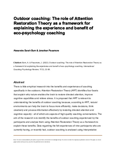 There is little empirical research into the benefits and experiences of coaching specifically in the outdoors. Attention Restoration Theory (ART) identifies four facets that explain why nature enables the brain to restore directed attention, improve cognitive capabilities and relieve stress. It is proposed that ART is relevant to understanding the benefits of outdoor coaching because, according to ART, natural environments can help the brain to focus more efficiently, make decisions, think creatively and process information effectively by restoring directed attention and cognitive capacity - all of which are aspects of high-quality coaching conversations. The aim of the research is to identify the benefits of outdoor coaching experienced by the participants and analyse them using Attention Restoration Theory as a framework to explain these benefits. Data regarding the felt experiences of nine participants who are currently having, or recently had, outdoor coaching is analysed using Interpretative Phenomenological Analysis (IPA) and discussed. The key findings show six identified key themes linking the participants’ felt experiences with the four facets of ART: Being side-by-side; movement and pace; the perceived benefits of outdoors vs indoors; thinking differently; openness and expanse; senses, emotions and feelings. We conclude that there are benefits to taking coaching conversations outside and that ART is a framework that can explain these benefits.