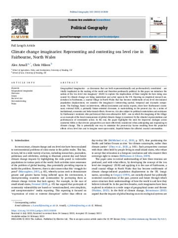 Geographical imaginaries – as discourses that are both representationally and performatively constituted – are vitally implicated in the making of the world and therefore profoundly political. In this paper we introduce the notion of the ‘sea level rise imaginary’ (SLRI) to explore the implications of these insights for how rising seas caused by climate change are being understood and acted upon in the UK. Drawing on empirical research undertaken in Fairbourne, a coastal village in North Wales that has become emblematic of sea level rise-induced population displacement, we consider the imaginary’s intersecting spatial, temporal and dramatic components. The findings, based on interviews, official documents and media reports, show how Fairbourne’s dominant, external SLRI, a primarily future-oriented discourse, is materialising in the present day via a series of institutional, economic and behavioural effects. However, it is also subject to political contestation and resistance by Fairbourne’s residents who put forward their own alternative SLRI – one in which the imagining of the village as an example of the local consequences of global climate change is countered by the situated representations and performances of community actors. In the end, the paper highlights the need for improved dialogue across contested SLRIs so that diverse perspectives are more effectively considered when anticipating and responding to climate change. This is potentially one way to minimise the present-day harms resulting from the projected effects of sea level rise and to imagine more open-ended, hopeful futures for affected coastal communities.