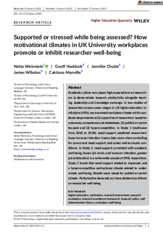 Supported or stressed while being assessed? How motivational climates in UK university workplaces promote or inhibit researcher well-being.