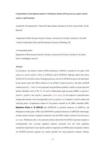 Wickramasuriya, A. M., Hewavithana, T. M., de Silva, K. K., Ullah, I. orcid id iconORCID: https://orcid.org/0000-0002-9367-6741 and Dunwell, J. M. orcid id iconORCID: https://orcid.org/0000-0003-2147-665X (2023) Comprehensive transcriptome analysis of arabidopsis thaliana DNA polymerase epsilon catalytic subunit A and B mutants. Tropical Plant Biology, 16 (1-2). pp. 12-31. ISSN 1935-9756 doi: 10.1007/s12042-023-09327-z