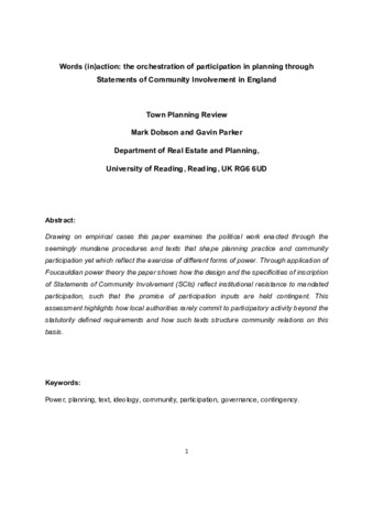 Dobson, M. orcid id iconORCID: https://orcid.org/0000-0001-8599-9797 and Parker, G. orcid id iconORCID: https://orcid.org/0000-0003-3079-4377 (2023) Words (in)action: the orchestration of participation in planning through Statements of Community Involvement in England. Town Planning Review. ISSN 1478-341X doi: 10.3828/tpr.2023.6