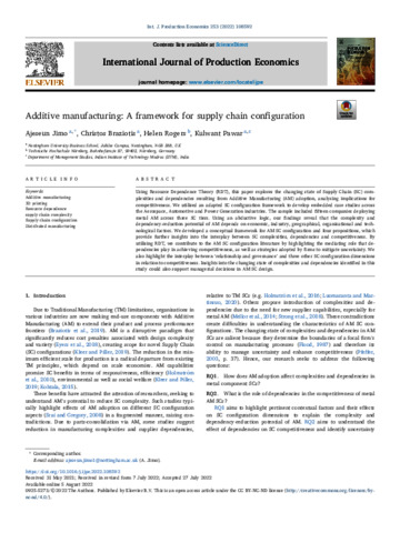 Using Resource Dependence Theory (RDT), this paper explores the changing state of Supply Chain (SC) complexities and dependencies resulting from Additive Manufacturing (AM) adoption, analysing implications for competitiveness. We utilised an adapted SC configuration framework to develop embedded case studies across the Aerospace, Automotive and Power Generation industries. The sample included fifteen companies deploying metal AM across three SC tiers. Using an abductive logic, our findings reveal that the complexity and dependency-reduction potential of AM depends on economic, industry, geographical, organisational and technological factors. We developed a conceptual framework for AM SC configuration and four propositions, which provide further insights into the interplay between SC complexities, dependencies and competitiveness. By utilising RDT, we contribute to the AM SC configuration literature by highlighting the mediating role that dependencies play in achieving competitiveness, as well as strategies adopted by firms to mitigate uncertainty. We also highlight the interplay between ‘relationship and governance’ and three other SC configuration dimensions in relation to competitiveness. Insights into the changing state of complexities and dependencies identified in this study could also support managerial decisions in AM SC design.