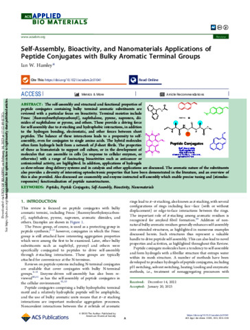 Self-assembly, bioactivity, and nanomaterials applications of peptide conjugates with bulky aromatic terminal groups.
