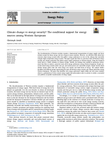 Arndt, C. (2023) Climate change vs energy security? The conditional support for energy sources among Western Europeans. Energy Policy, 174. 113471. ISSN 0301-4215 doi: 10.1016/j.enpol.2023.113471
