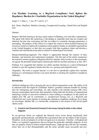 Singh, C., Zhao, L., Lin, W. and Ye, Z. (2022) Can machine learning, as a RegTech compliance tool, lighten the regulatory burden for charitable organisations in the United Kingdom? Journal of Financial Crime, 29 (1). pp. 45-61. ISSN 1359-0790 doi: 10.1108/JFC-06-2021-0131