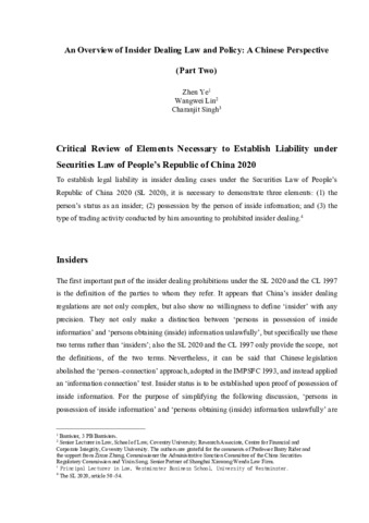 Ye, Z., Lin, W. and Singh, C. (2020) An overview of insider dealing law and policy: a Chinese perspective (part two). Company Lawyer, 41 (11). pp. 374-379. ISSN 0144-1027