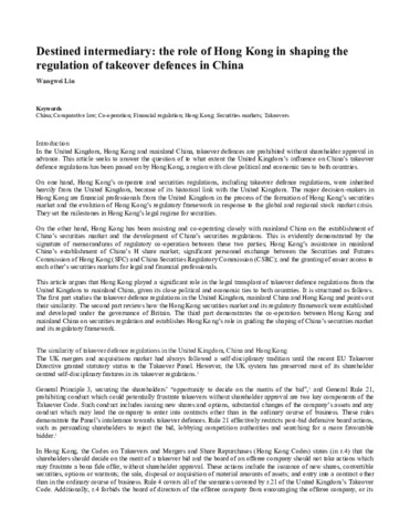 Lin, W. (2012) Destined intermediary: the role of Hong Kong in shaping the regulation of takeover defences in China. Company Lawyer, 33 (5). pp. 145-151. ISSN 0144-1027