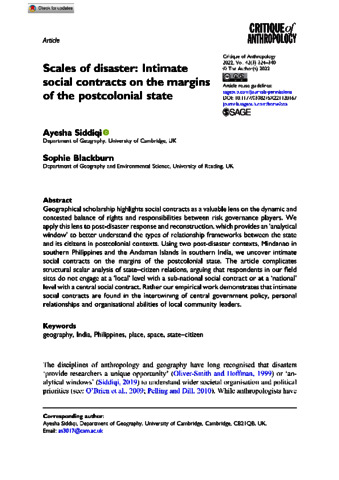Geographical scholarship highlights social contracts as a valuable lens on the dynamic and contested balance of rights and responsibilities between risk governance players. We apply this lens to post-disaster response and reconstruction, which provides an ‘analytical window’ to better understand the types of relationship frameworks between the state and its citizens in postcolonial contexts. Using two post-disaster contexts, Mindanao in southern Philippines and the Andaman Islands in southern India, we uncover intimate social contracts on the margins of the postcolonial state. The article complicates structural scalar analysis of state–citizen relations, arguing that respondents in our field sites do not engage at a ‘local’ level with a sub-national social contract or at a ‘national’ level with a central social contract. Rather our empirical work demonstrates that intimate social contracts are found in the intertwining of central government policy, personal relationships and organisational abilities of local community leaders.