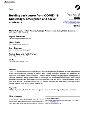 COVID-19 recovery is an opportunity to enhance life chances by Building Back Better, an objective promoted by the UN and deployed politically at national level. To help understand emergent and intentional opportunities to Build Back Better, we propose a research agenda drawing from geographical thinking on social contracts, assemblage theory and the politics of knowledge. This points research towards the ways in which everyday and professional knowledge cocreation constrains vision and action. Whose knowledge is legitimate, how legitimacy is ascribed and the place of science, the media and government in these processes become sites for progressive Building Back Better.
