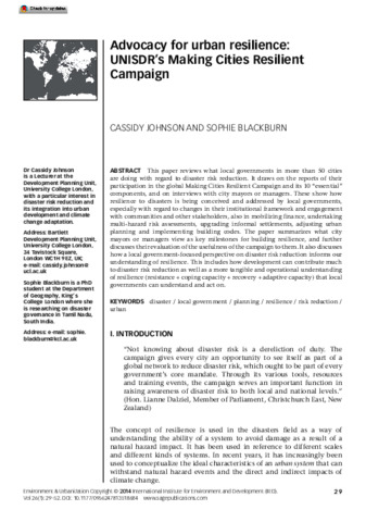 This paper reviews what local governments in more than 50 cities are doing with regard to disaster risk reduction. It draws on the reports of their participation in the global Making Cities Resilient Campaign and its 10 “essential” components, and on interviews with city mayors or managers. These show how resilience to disasters is being conceived and addressed by local governments, especially with regard to changes in their institutional framework and engagement with communities and other stakeholders, also in mobilizing finance, undertaking multi-hazard risk assessments, upgrading informal settlements, adjusting urban planning and implementing building codes. The paper summarizes what city mayors or managers view as key milestones for building resilience, and further discusses their evaluation of the usefulness of the campaign to them. It also discusses how a local government-focused perspective on disaster risk reduction informs our understanding of resilience. This includes how development can contribute much to disaster risk reduction as well as a more tangible and operational understanding of resilience (resistance + coping capacity + recovery + adaptive capacity) that local governments can understand and act on.