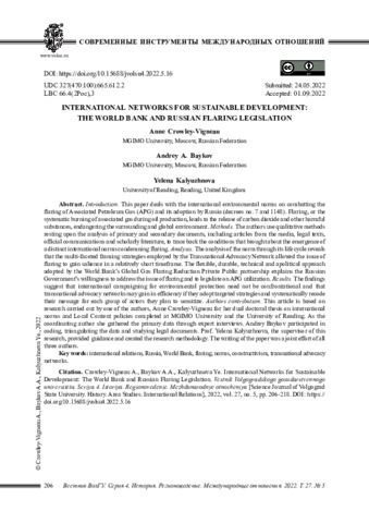 Introduction. This paper deals with the international environmental norms on combatting the flaring of Associated Petroleum Gas (APG) and its adoption by Russia (decrees no. 7 and 1148). Flaring, or the systematic burning of associated gas during oil production, leads to the release of carbon dioxide and other harmful substances, endangering the surrounding and global environment. Methods. The authors use qualitative methods resting upon the analysis of primary and secondary documents, including articles from the media, legal texts, official communications and scholarly literature, to trace back the conditions that brought about the emergence of a distinct international norms condemning flaring. Analysis. The analysis of the norm through its life cycle reveals that the multi-faceted framing strategies employed by the Transnational Advocacy Network allowed the issue of flaring to gain salience in a relatively short timeframe. The flexible, durable, technical and apolitical approach adopted by the World Bank’s Global Gas Flaring Reduction Private Public partnership explains the Russian Government’s willingness to address the issue of flaring and to legislate on APG utilization. Results. The findings suggest that international campaigning for environmental protection need not be confrontational and that transnational advocacy networks may gain in efficiency if they adopt targeted strategies and systematically recode their message for each group of actors they plan to sensitize. Authors contribution. This article is based on research carried out by one of the authors, Anne Crowley-Vigneau for her dual doctoral thesis on international norms and Local Content policies completed at MGIMO University and the University of Reading. As the coordinating author she gathered the primary data through expert interviews. Andrey Baykov participated in coding, triangulating the data and studying legal documents. Prof. Yelena Kalyuzhnova, the supervisor of this research, provided guidance and created the research methodology. The writing of the paper was a joint effort of all three authors.