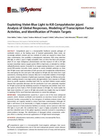 Exploiting violet-blue light to kill Campylobacter jejuni: analysis of global responses, modeling of transcription factor activities, and identification of protein targets.