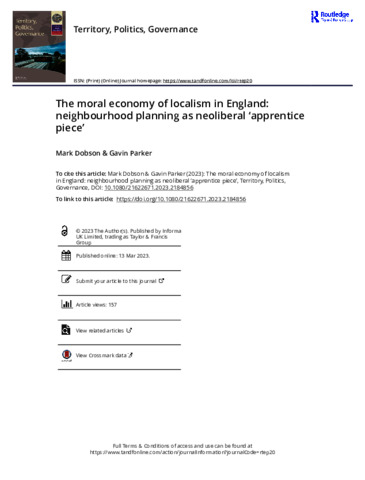 The moral economy of localism in England: neighbourhood planning as neoliberal ‘apprentice piece'.