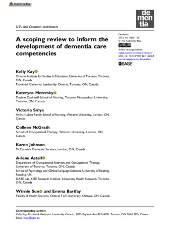 Kay, K., Metersky, K., Smye, V., McGrath, C., Johnson, K., Astell, A. orcid id iconORCID: https://orcid.org/0000-0002-6822-9472, Sun, W. and Bartfay, E. (2023) A scoping review to inform the development of dementia care competencies. Dementia, 22 (5). pp. 1138-1163. ISSN 1741-2684 doi: 10.1177/14713012231165568