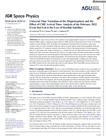 Lockwood, M. orcid id iconORCID: https://orcid.org/0000-0002-7397-2172, Owens, M. J. orcid id iconORCID: https://orcid.org/0000-0003-2061-2453 and Barnard, L. A. orcid id iconORCID: https://orcid.org/0000-0001-9876-4612 (2023) Universal time variations in the Magnetosphere and the effect of CME arrival time: analysis of the February 2022 event that led to the loss of Starlink satellites. Journal of Geophysical Research: Space Physics, 128 (3). e2022JA031177. ISSN 2169-9402 doi: 10.1029/2022JA031177