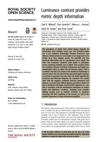 Hibbard, P. B., Goutcher, R., Hornsey, R. L., Hunter, D. W. and Scarfe, P. orcid id iconORCID: https://orcid.org/0000-0002-3587-6198 (2023) Luminance contrast provides metric depth information. Royal Society Open Science, 10 (2). 220567. ISSN 2054-5703 doi: 10.1098/rsos.220567