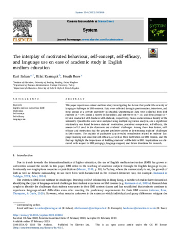 Sahan, K. orcid id iconORCID: https://orcid.org/0000-0003-4423-3108, Kamaşak, R. and Rose, H. (2023) The interplay of motivated behaviour, self-concept, self-efficacy, and language use on ease of academic study in English medium education. System, 114. 103016. ISSN 0346-251X doi: 10.1016/j.system.2023.103016