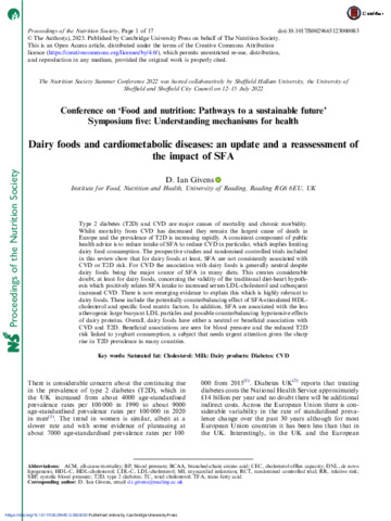 Givens, I. orcid id iconORCID: https://orcid.org/0000-0002-6754-6935 (2023) Dairy foods and cardiometabolic diseases: an update and a reassessment of the impact of SFA. Proceedings of the Nutrition Society, 82 (3). pp. 329-345. ISSN 0029-6651 doi: 10.1017/S0029665123000083