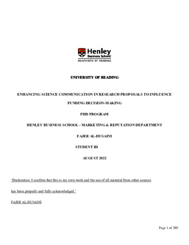 Al-Husaini, F. (2022) Enhancing science communication in research proposals to influence funding decision-making. PhD thesis, University of Reading. doi: 10.48683/1926.00111113