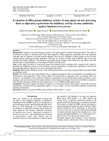 Alsallami, D., Alsultan, A., Abbas, K. and Clarke, S. R. (2023) Evaluation of efflux pump inhibitory activity of some plant extracts and using them as adjuvants to potentiate the inhibitory activity of some antibiotics against Staphylococcus aureus. Open Veterinary Journal, 13 (1). pp. 42-47. ISSN 2226-4485 doi: 10.5455/OVJ.2023.v13.i1.5