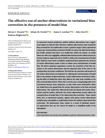 Francis, D. J., Fowler, A. M. orcid id iconORCID: https://orcid.org/0000-0003-3650-3948, Lawless, A. S. orcid id iconORCID: https://orcid.org/0000-0002-3016-6568, Eyre, J. and Migliorini, S. (2023) The effective use of anchor observations in variational bias correction in the presence of model bias. Quarterly Journal of the Royal Meteorological Society, 149 (754). pp. 1789-1809. ISSN 1477-870X doi: 10.1002/qj.4482