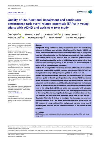 Quality of life, functional impairment and continuous performance task event‐related potentials (ERPs) in young adults with ADHD and autism: a twin study.