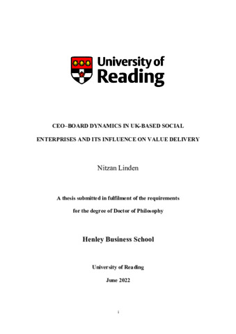 Linden, N. (2022) CEO-board dynamics in UK-based social enterprises and its influence on value delivery. PhD thesis, University of Reading. doi: 10.48683/1926.00111271