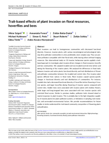 Plant invasions can lead to homogeneous communities with decreased functional diversity. However, invasive plants, with various morphological and phenological traits, may drive pollinator communities in a less predictable, more complex way. They can promote pollinators compatible with their floral traits, while leaving others without foraging resources. Our observational study on 10 invasive herbaceous species applied a trait‐based approach to investigate plant invasion‐driven changes in floral resources, hoverfly and bee communities. We sampled invaded and non‐invaded (control) sites before and during the flowering of the invasive plants. We analysed the differences in floral traits between invasive and native plants, functional diversity and trait distributions of flower and pollinator communities between the invaded and control sites. Five invasive plant species differed from natives in floral traits. Plant invasion caused species‐specific changes in functional diversity and trait distributions of communities. For instance, invaded sites had a decreased functional diversity of hoverflies before flowering of invasive species, and larger hoverflies during flowering of invasive species compared with control sites. Smaller bees were associated with invasive plants with shallow flowers, while larger and long‐tongued bees were associated with two invasive species with restricted floral access. Similar to previous studies, pollinator traits showed mixed or neutral responses to plant invasion. This is probably due to the high integration capability of invasive plants into plant‐pollinator systems, or limitations in sampling, trait resolution, and unrevealed environmental factors. We provide recommendations for future studies to better understand the trait‐based community composition of flowering plants and pollinators.