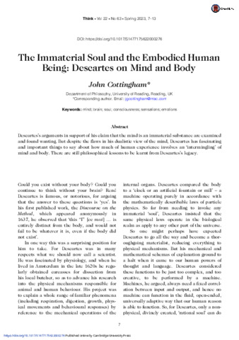 Cottingham, J. (2023) The immaterial soul and the embodied human being: Descartes on mind and body. Think, 22 (63). pp. 7-13. ISSN 1755-1196 doi: 10.1017/S1477175622000276