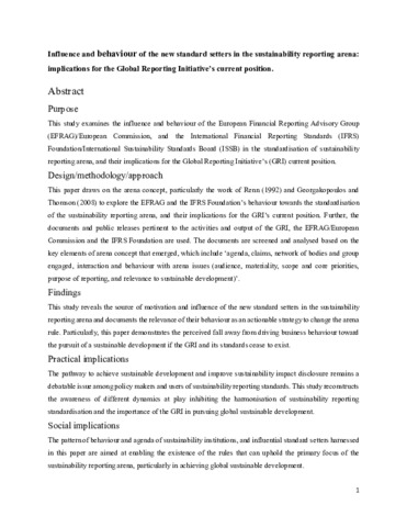 Purpose This study aims to examine the influence and behaviour of the European Financial Reporting Advisory Group (EFRAG)/European Commission, and the International Financial Reporting Standards (IFRS) Foundation/International Sustainability Standards Board in the standardisation of sustainability reporting arena and their implications for the Global Reporting Initiative’s (GRI) current position. Design/methodology/approach This paper draws on the arena concept, particularly the work of Renn (1992) and Georgakopoulous and Thomson (2008), to explore the EFRAG and the IFRS Foundation’s behaviour towards the standardisation of the sustainability reporting arena and their implications for the GRI’s current position. Further, the documents and public releases pertinent to the activities and output of the GRI, the EFRAG/European Commission and the IFRS Foundation are used. The documents are screened and analysed based on the key elements of arena concept that emerged, which includes “agenda, claims, network of bodies and group engaged, interaction and behaviour with arena issues (audience, materiality, scope and core priorities, purpose of reporting and relevance to sustainable development)”. Findings This study reveals the source of motivation and influence of the new standard setters in the sustainability reporting arena and documents the relevance of their behaviour as an actionable strategy to change the arena rule. Particularly, this paper demonstrates the perceived fall away from driving business behaviour towards the pursuit of sustainable development if the GRI and its standards cease to exist. Practical implications The pathway to achieve sustainable development and improve sustainability impact disclosure remains a debatable issue among policymakers and users of sustainability reporting standards. This study reconstructs the awareness of different dynamics at play inhibiting the harmonisation of sustainability reporting standardisation and the importance of the GRI in pursuing global sustainable development. Social implications The pattern of behaviour and agenda of sustainability institutions and influential standard setters harnessed in this paper are aimed at enabling the existence of the rules that can uphold the primary focus of the sustainability reporting arena, particularly in achieving global sustainable development. Originality/value This paper furthers the understanding of the importance of the GRI in upholding the key tenets and traditional agenda of sustainability reporting and sustainable development.