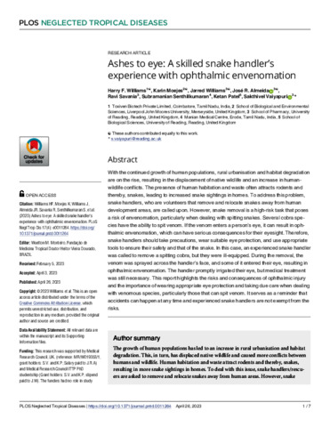 Williams, H. F., Moejes, K., Williams, J., Almeida, J. R. orcid id iconORCID: https://orcid.org/0000-0002-4637-4468, Savania, R., Senthilkumaran, S., Patel, K. and Vaiyapuri, S. orcid id iconORCID: https://orcid.org/0000-0002-6006-6517 (2023) Ashes to eye: a skilled snake handler’s experience with ophthalmic envenomation. PLoS Neglected Tropical Diseases, 17 (4). e0011264. ISSN 1935-2735 doi: 10.1371/journal.pntd.0011264