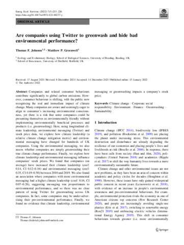 Johnson, T. F. and Greenwell, M. P. orcid id iconORCID: https://orcid.org/0000-0001-5406-6222 (2022) Are companies using Twitter to greenwash and hide bad environmental performance? Energy, Ecology and Environment, 7 (3). pp. 213-226. ISSN 2363-8338 doi: 10.1007/s40974-021-00237-y
