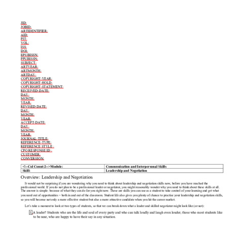 It would not be surprising if you are wondering why you need to think about leadership and negotiation skills now, before you have reached the professional world. If you do not plan to be a professional leader or negotiator, you might reasonably wonder why you need to think about these skills at all. The answer is simple: because of what they can do for you right now. These are skills you can use as a student to take control of your learning and get what you need out of opportunities – both in and out of the classroom. Student life also gives you plenty of chance to practise your leadership and negotiation skills, so you will become not only a more effective student but also a more attractive candidate when you hit the career market. Let’s take a moment to look at two types of students, so that we can break down what a leader and skilled negotiator might look like (or not): 1. A leader? Students who are the life and soul of every party and who can talk loudly and laugh even louder; those who most students like to be near, who are happy to have their say in any situation. 2. Funnily enough, these students often struggle to lead. You might see them literally leading their admirers across campus towards the nearest nightclub, but the qualities needed for effective leadership can be lacking. Loving to talk makes it very difficult to chair a meeting, for example. Voicing strong views can leave members of your team feeling isolated. Being hugely popular can leave you vulnerable, shying away from difficult or sensitive conversations. Being used to getting your own way or being afraid of being even a little bit unpopular can make negotiation very difficult. 3. A leader? Students who talk less than they think, who are willing to listen to others, and sometimes – but not always – voice their own views. Students who lead less from the front but spend their energy helping everyone work together. Students who are not easily distracted and are goal centred. 4. These students can become excellent leaders, leading by example and negotiation and making sure that a team works well together. They may not be especially well noticed, but they are somehow known to be reliable and determined, even though they have not been a leader in social groups. There are many different types of leader, and the examples here are built on generalisations, but hopefully you get the point: leadership is a skill that can be developed like any other, and negotiation can become a positive part of your life. Developing leadership skills relies on: 1. Identifying the leadership skills and qualities that you already have, or those that come most naturally to you 2. Developing your skills as an influential team player so that you can pivot to leadership when the need arises 3. Finding opportunities to practise leadership in the relatively low-risk situation of studying Developing negotiation skills relies on: 1. A clear sense of what you want 2. A willingness to value the views of others 3. An understanding of how compromise works so that everyone wins Now that the myths are dispelled, we can move on to developing your skills as both an effective leader and a successful negotiator.