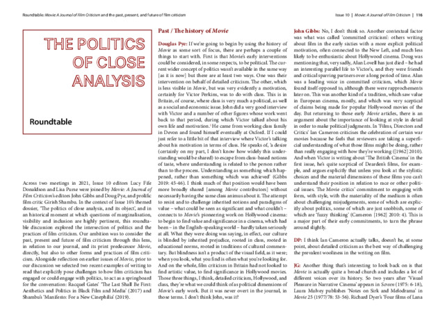 A roundtable discussion featuring movie editors Lucy Fife Donaldson, John Gibbs, Lisa Purse and Douglas Pye were joined by influential film critic, editor and blogger Girish Shambu. In the context of a themed dossier in Issue 10 of Movie: a journal of film criticism – ‘The politics of close analysis, and its object’ – and in an historical moment at which questions of marginalisation, visibility and inclusion are highly pertinent, the discussion explored the intersection of politics and the practices of film criticism. The ambition was to consider the past, present and future of film criticism through this lens, in relation to Movie: a journal of film criticism, its print predecessor Movie and other forms and practices of film criticism. Prior to the discussion two recent articles were selected as a springboard for the conversation: Racquel Gates’ ‘The Last Shall Be First: Aesthetics and Politics in Black Film and Media’ (2017) and Shambu’s ‘Manifesto: For a New Cinephilia’ (2019).