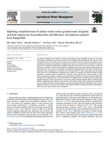 Exploring competitiveness of surface water versus ground water irrigation and their impacts on rice productivity and efficiency: an empirical analysis from Bangladesh.