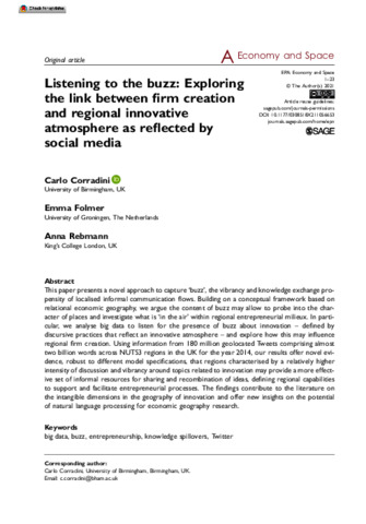 This paper presents a novel approach to capture ‘buzz’, the vibrancy and knowledge exchange propensity of localised informal communication flows. Building on a conceptual framework based on relational economic geography, we argue the content of buzz may allow to probe into the character of places and investigate what is ‘in the air’ within regional entrepreneurial milieux. In particular, we analyse big data to listen for the presence of buzz about innovation – defined by discursive practices that reflect an innovative atmosphere – and explore how this may influence regional firm creation. Using information from 180 million geolocated Tweets comprising almost two billion words across NUTS3 regions in the UK for the year 2014, our results offer novel evidence, robust to different model specifications, that regions characterised by a relatively higher intensity of discussion and vibrancy around topics related to innovation may provide a more effective set of informal resources for sharing and recombination of ideas, defining regional capabilities to support and facilitate entrepreneurial processes. The findings contribute to the literature on the intangible dimensions in the geography of innovation and offer new insights on the potential of natural language processing for economic geography research.