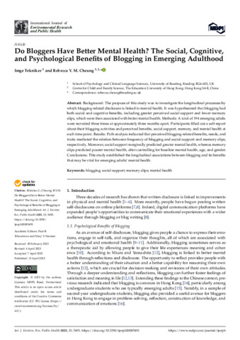 Do bloggers have better mental health? The social, cognitive, and psychological benefits of blogging in emerging adulthood.