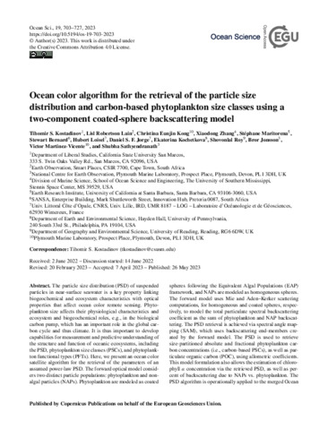 Kostadinov, T. S., Robertson Lain, L., Kong, C. E., Zhang, X., Maritorena, S., Bernard, S., Loisel, H., Jorge, D. S.F., Kochetkova, E., Roy, S. orcid id iconORCID: https://orcid.org/0000-0003-2543-924X, Jonsson, B., Martinez-Vicente, V. and Sathyendranath, S. (2023) Ocean color algorithm for the retrieval of the particle size distribution and carbon-based phytoplankton size classes using a two-component coated-spheres backscattering model. Ocean Science, 19 (3). pp. 703-727. ISSN 1812-0792 doi: 10.5194/os-19-703-2023