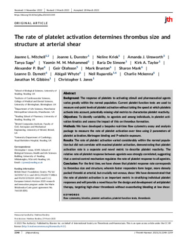 Mitchell, J. L., Dunster, J. L. orcid id iconORCID: https://orcid.org/0000-0001-8986-4902, Kriek, N., Unsworth, A. J., Sage, T., Mohammed, Y. M. M., De Simone, I., Taylor, K. A. orcid id iconORCID: https://orcid.org/0000-0002-4599-7727, Bye, A. P. orcid id iconORCID: https://orcid.org/0000-0002-2061-2253, Ólafsson, G., Brunton, M., Mark, S., Dymott, L. D., Whyte, A., Ruparelia, N., Mckenna, C., Gibbins, J. M. orcid id iconORCID: https://orcid.org/0000-0002-0372-5352 and Jones, C. I. orcid id iconORCID: https://orcid.org/0000-0001-7537-1509 (2023) The rate of platelet activation determines thrombus size and structure at arterial shear. Journal of Thrombosis and Haemostasis, 21 (8). pp. 2248-2259. ISSN 1538-7836 doi: 10.1016/j.jtha.2023.03.044