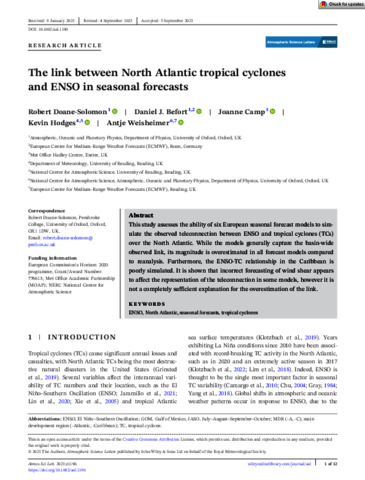 Doane-Solomon, R., Befort, D. J., Camp, J., Hodges, K. orcid id iconORCID: https://orcid.org/0000-0003-0894-229X and Weisheimer, A. (2023) The link between North Atlantic tropical cyclones and ENSO in seasonal forecasts. Atmospheric Science Letters. e1190. ISSN 1530-261X doi: 10.1002/asl.1190