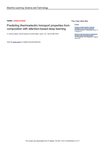 Antunes, L. M., Butler, K. T. and Grau-Crespo, R. orcid id iconORCID: https://orcid.org/0000-0001-8845-1719 (2023) Predicting thermoelectric transport properties from composition with attention-based deep learning. Machine Learning: Science and Technology, 4 (1). 015037. ISSN 2632-2153 doi: 10.1088/2632-2153/acc4a9